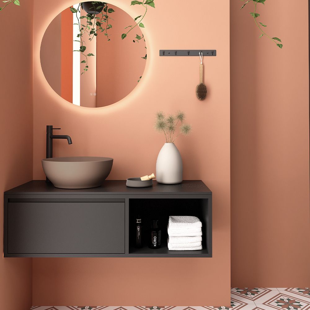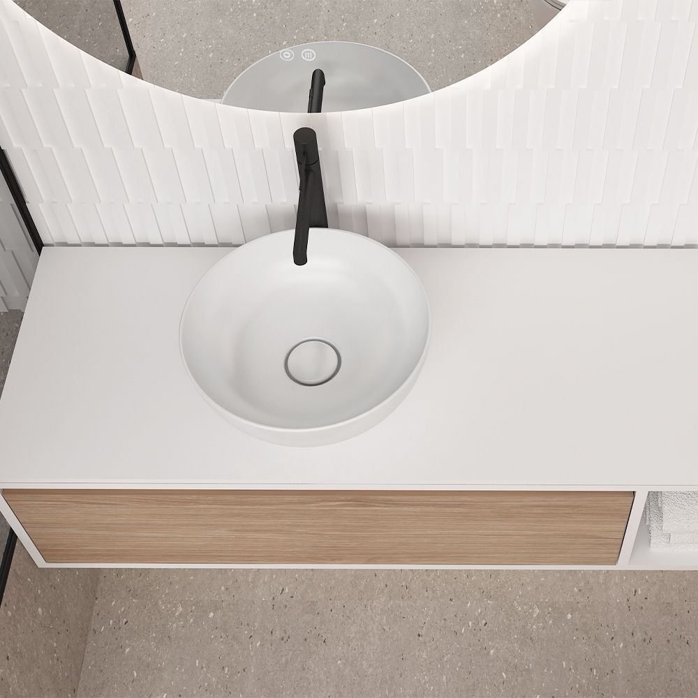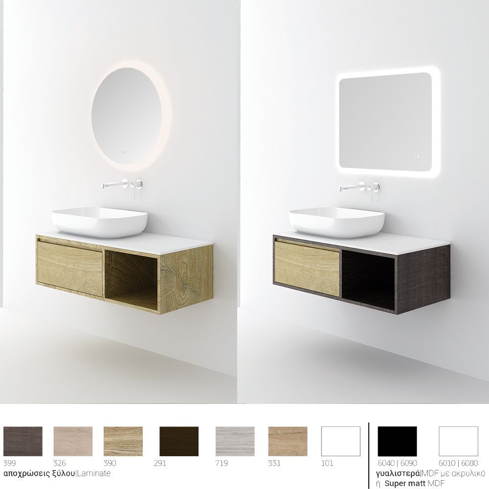 Κρεμαστό έπιπλο μπάνιου Drawer with shelf – σειρά επίπλων Drawer. Ένα έπιπλο μπάνιου, βαρέως τύπου ιδανικό για οικιακή χρήση. Αποτελείται από, κρεμαστή βάση με συρτάρι με μηχανισμό κλεισίματος soft close (Blum), πλαϊνό ράφι (40εκ.) και επικάλυψη από ομοιογενές υλικό σε λευκό. Μπορείτε να ολοκληρώσετε την εικόνα του επίπλου προσθέτοντας καθρέπτη δικής σας επιλογής (ντουλάπι, εταζέρα με ντουλαπάκι ή καθρέπτη με πλαίσιο ή καθρέπτη LED). Όλα τα έπιπλα της εταιρείας Orabella μπορούν να πάρουν στήλες μπάνιου επιδαπέδιες ή κρεμαστές για επιπλέον χώρο αποθήκευσης, ενώ υπάρχει δυνατότητα προσθήκης ντουλαπιού πλυντηρίου σε χρώμα δικής σας επιλογής. Διατίθεται σε έξι διαφορετικές αποχρώσεις ξύλου και σε λευκό χρώμα – Laminate καθώς και σε μαύρο και λευκό ματ mdf. Κατόπιν επιλογής, μπορεί να συνοδευτεί με γραμμικό φωτιστικό μπάνιου Led. Στην τιμή δεν περιλαμβάνεται ο νιπτήρας.